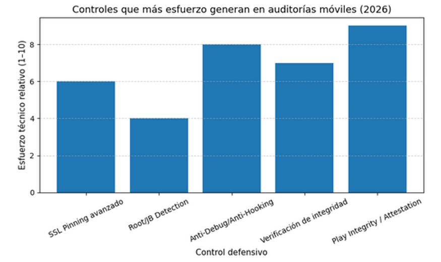 Estimación del esfuerzo técnico relativo requerido para evadir distintos mecanismos de protección en aplicaciones móviles modernas. Valores basados en experiencia práctica en auditorías avanzadas y entornos con integridad reforzada.
