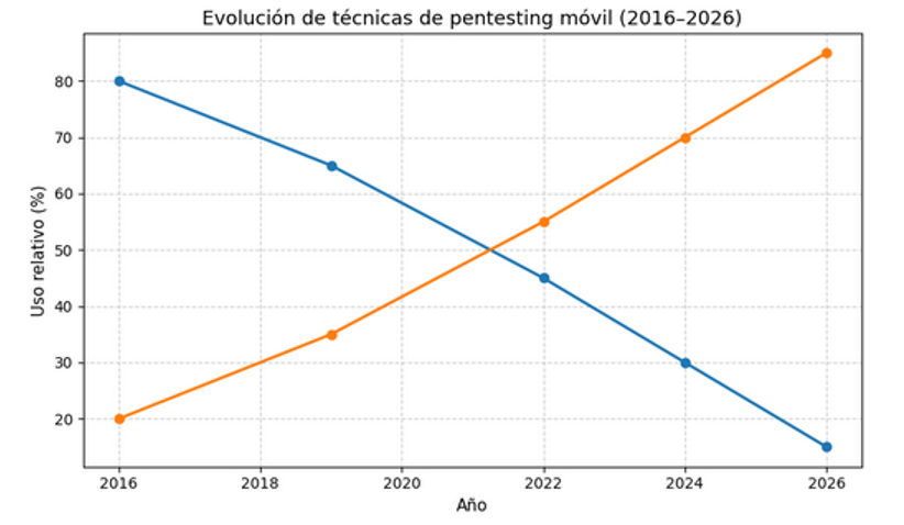 Evolución estimada del peso relativo de técnicas clásicas (MITM, reversing superficial) frente a técnicas modernas basadas en instrumentación dinámica y análisis de lógica de negocio. Representación conceptual basada en tendencias observadas en auditorías móviles entre 2016 y 2026.